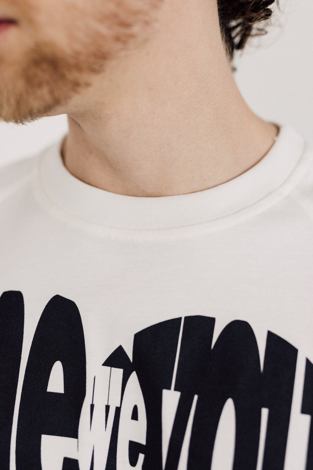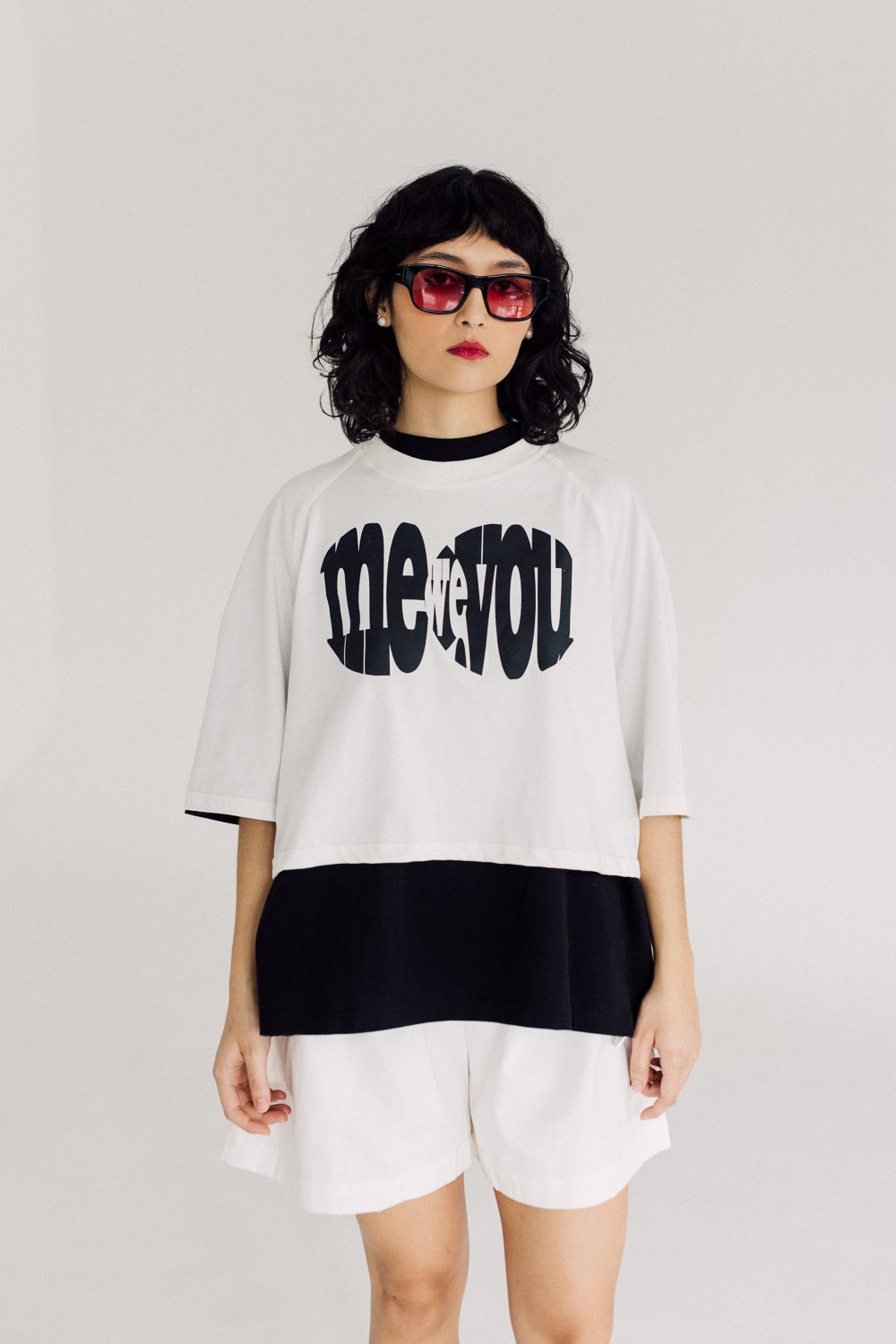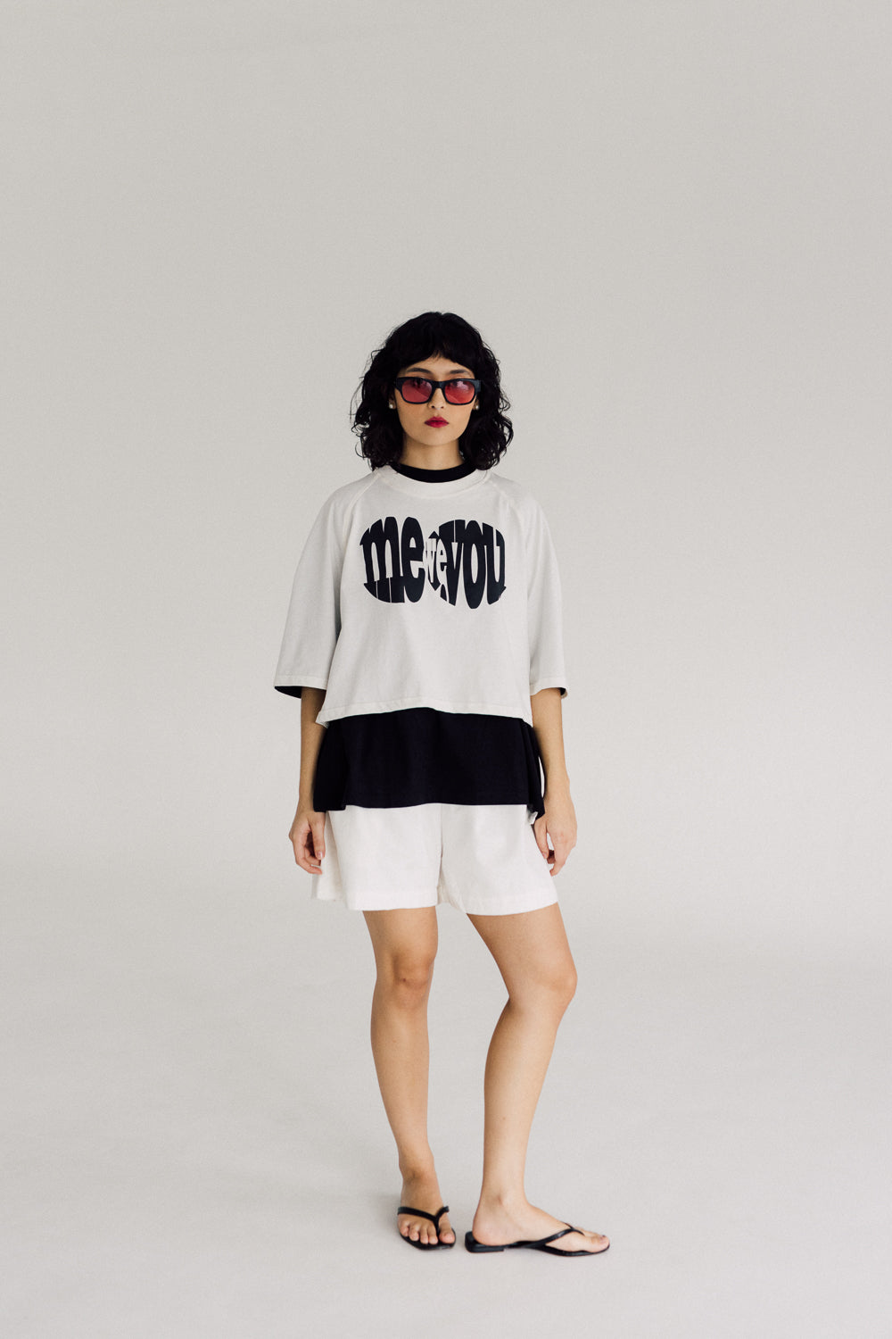 Esta camiseta crema fondo entero incluye un estampado en serigrafía en negro a un solo color que representa un diagrama de Venn con las palabras ME WE YOU siendo el WE la intersección de los dos circulos.