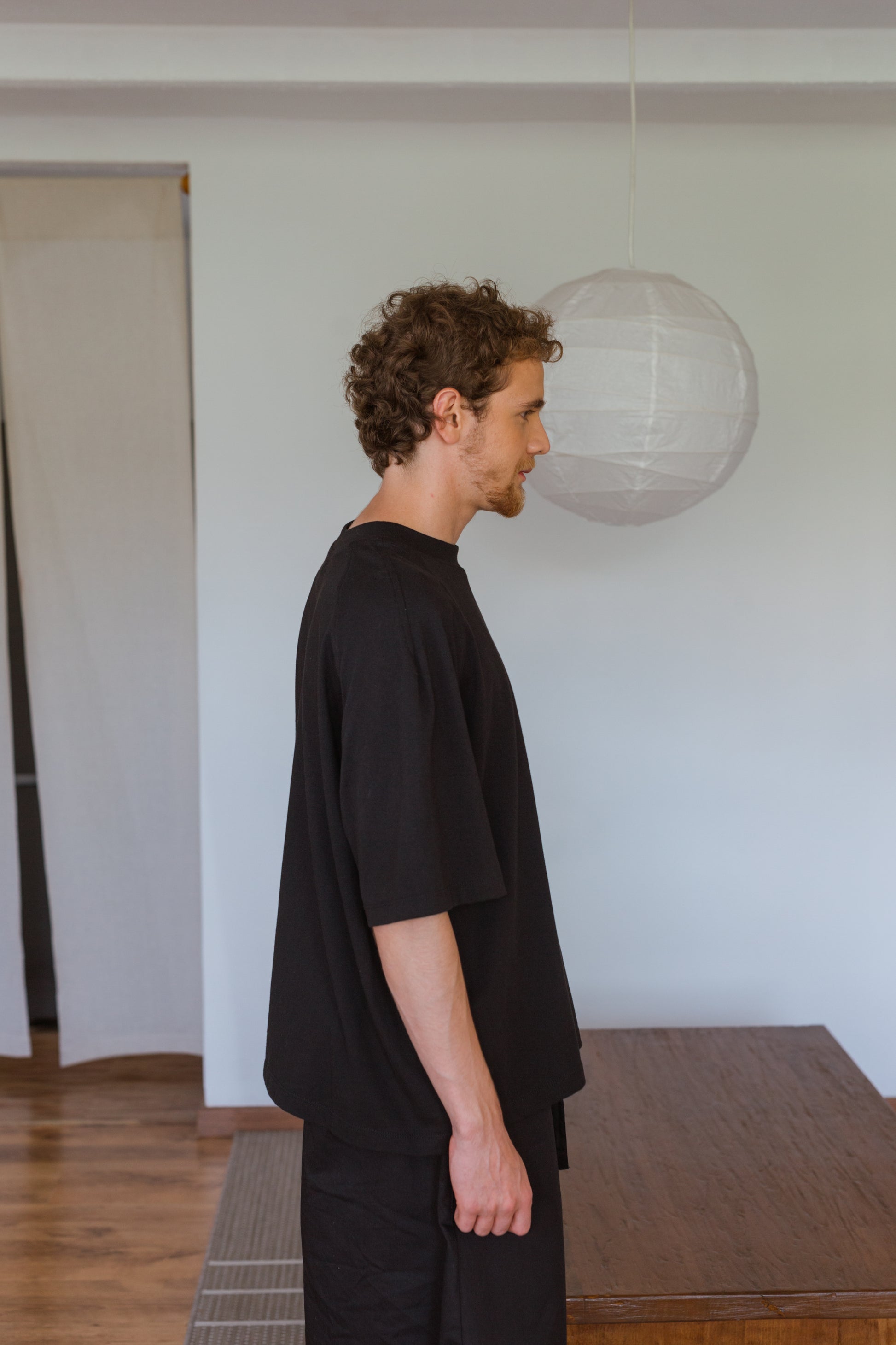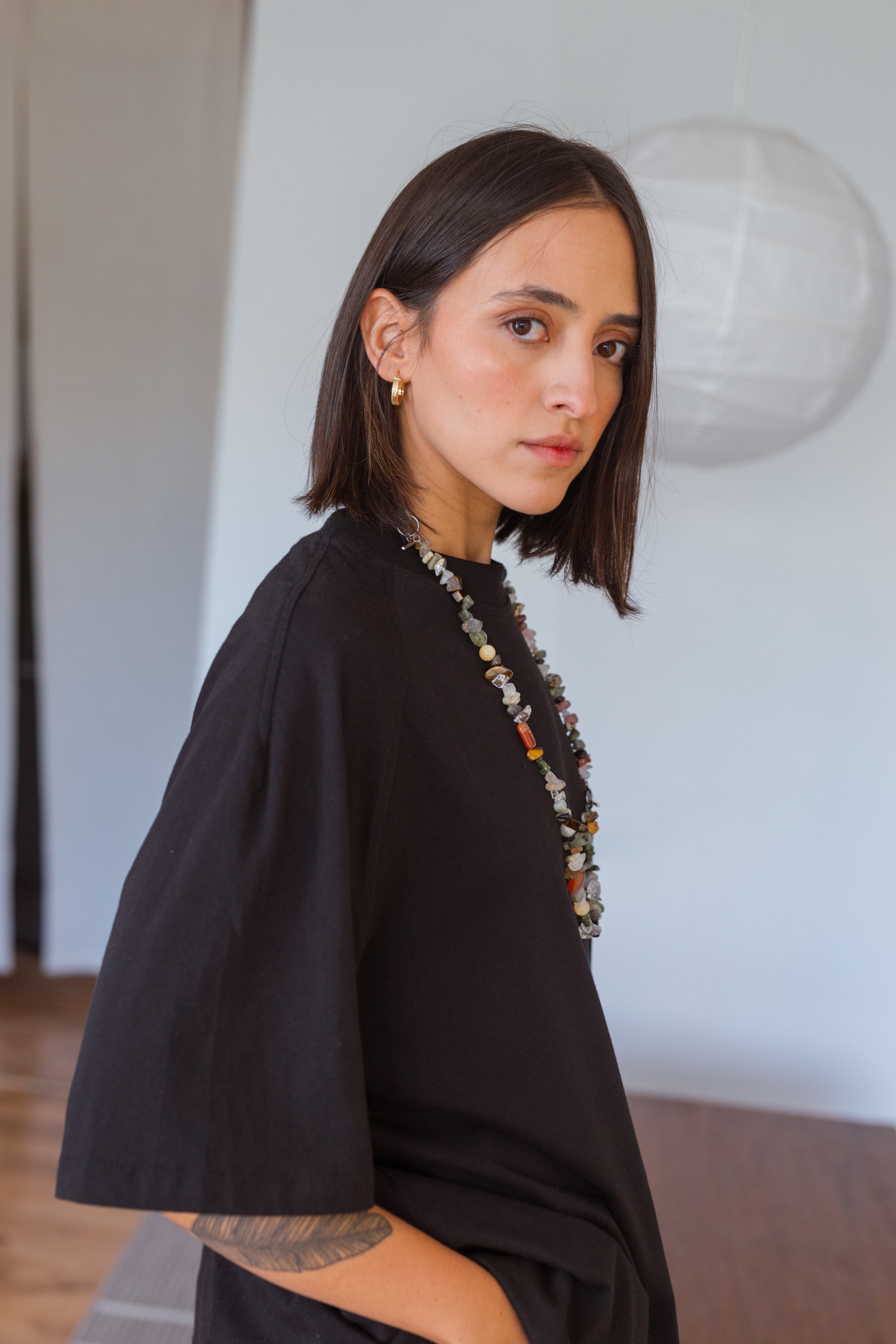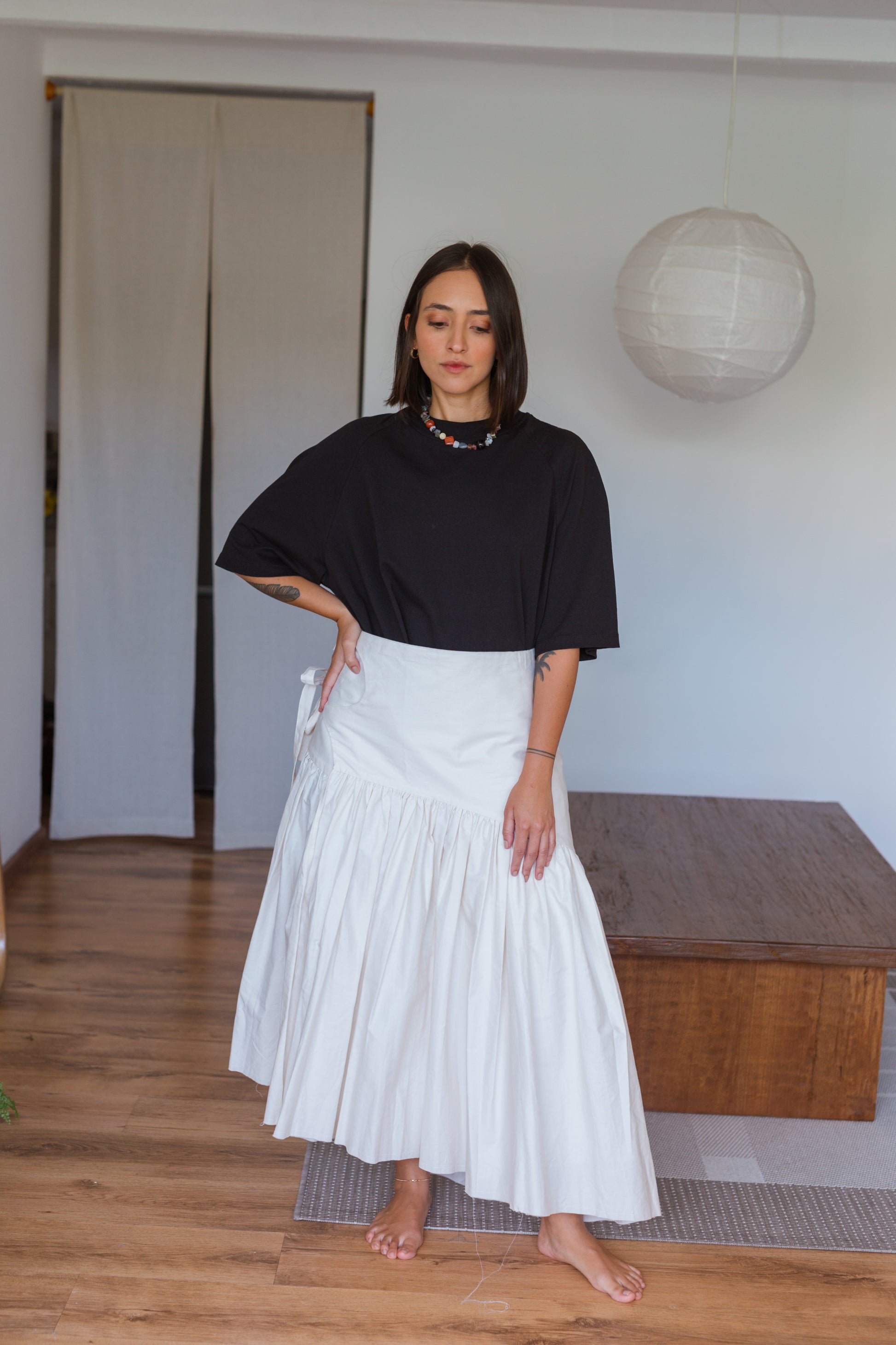 Multitalla_ Esta prenda está diseñada para que la silueta se ajuste al cuerpo del usuario, ya sea por amarres o su manera de caer sobre el cuerpo. Al ser construidas en algodón 100% nuestras prendas RIDDANCE no tienen stretch y la moldería es la que da el ajuste, por este motivo todas nuestras prendas tendrán un fit diferente según el cuerpo que las use.