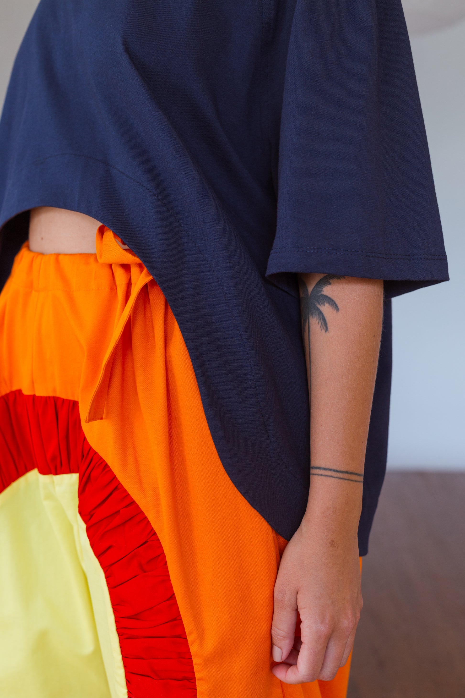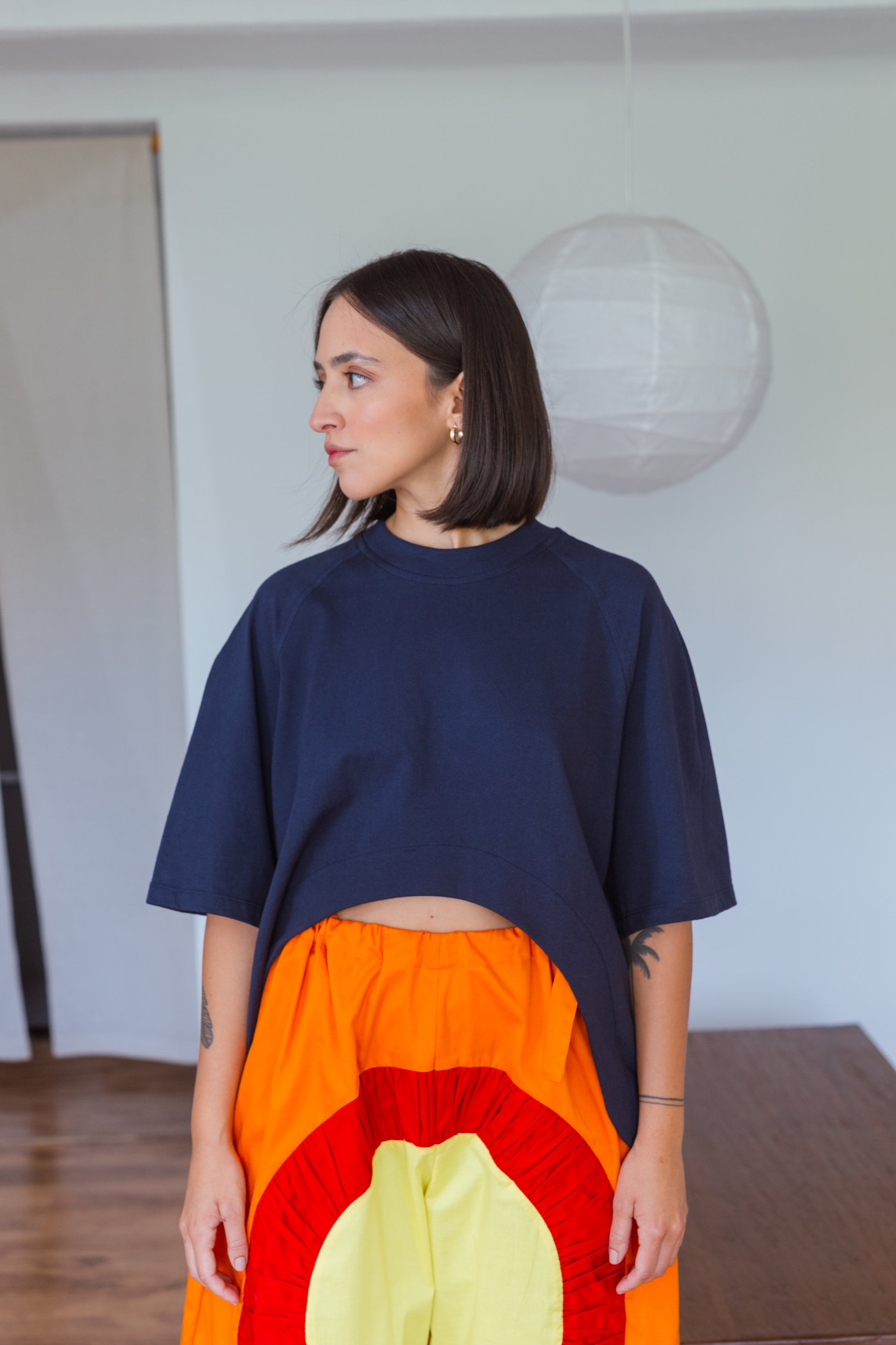 Nuestra camiseta centro nació con la idea de crear prendas de fondo de vestuario desde el universo RIDDANCE. Es una prenda versatil que por un lado puede ayudar a acentuar la pretina de la prenda inferior que uses o simplemente resaltar la cintura.