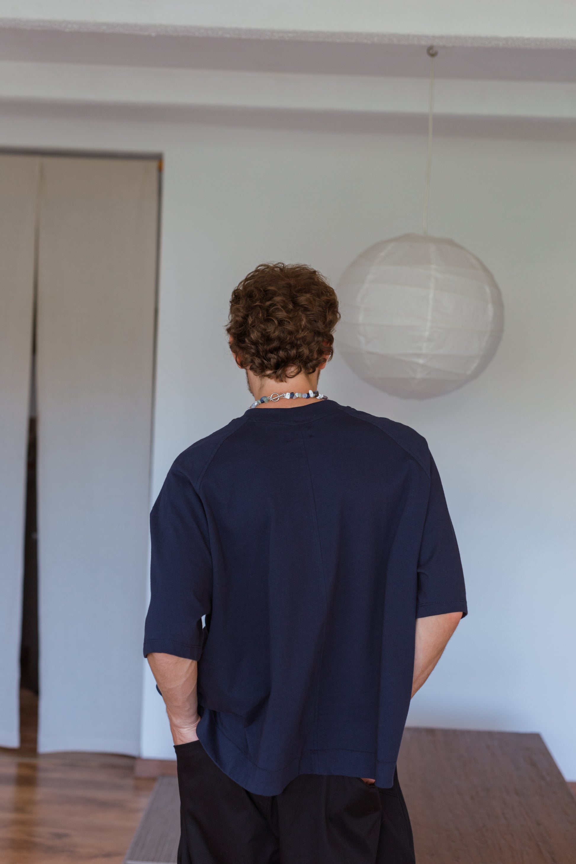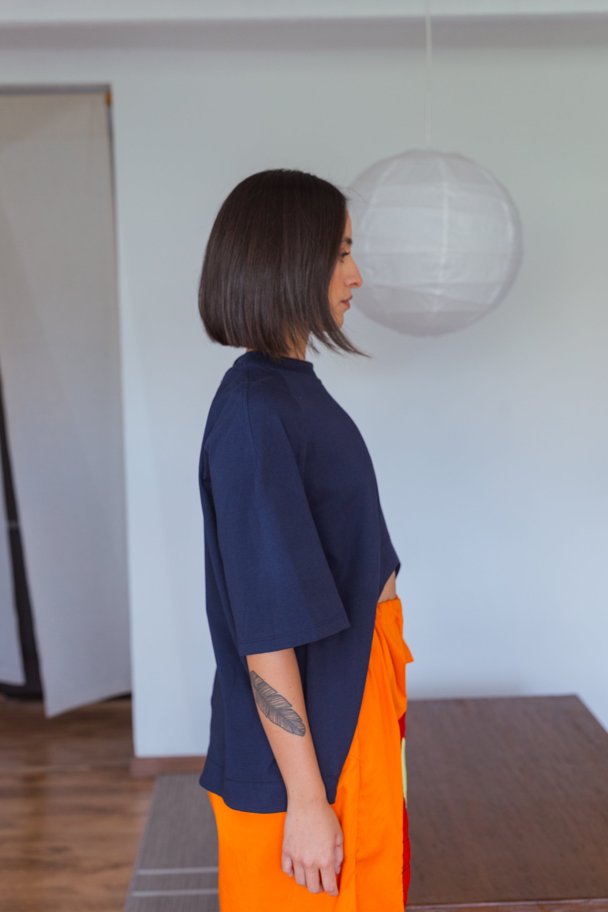 Centro es una camiseta fabricada en algodón 100% con mangas tipo ranglan o raglán diseñadas con un corte especial en hombro para dar el mejor ajuste, esta camiseta cuenta además con una silueta en medio círculo en el ruedo centro de la prenda, el cuerpo de esta camiseta está formado por un solo corte que se ensambla en el fondo espalda, logrando darle así una continuidad envolvente a la prenda sobre el cuerpo.