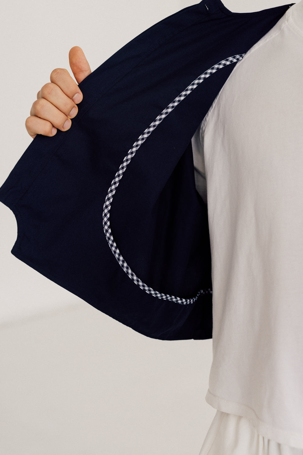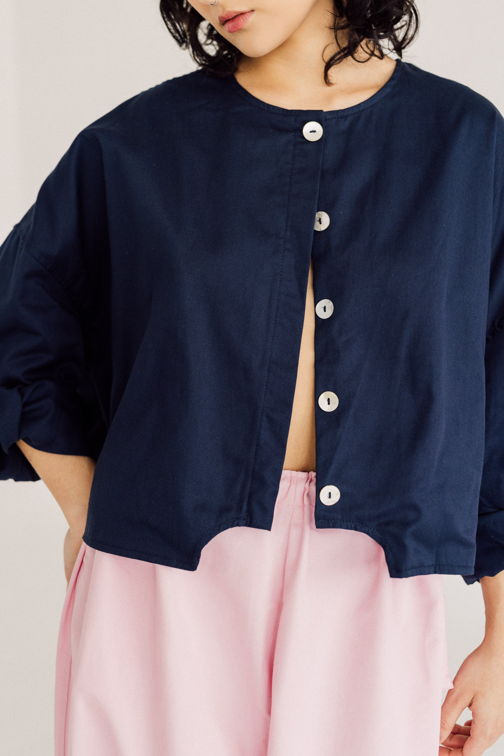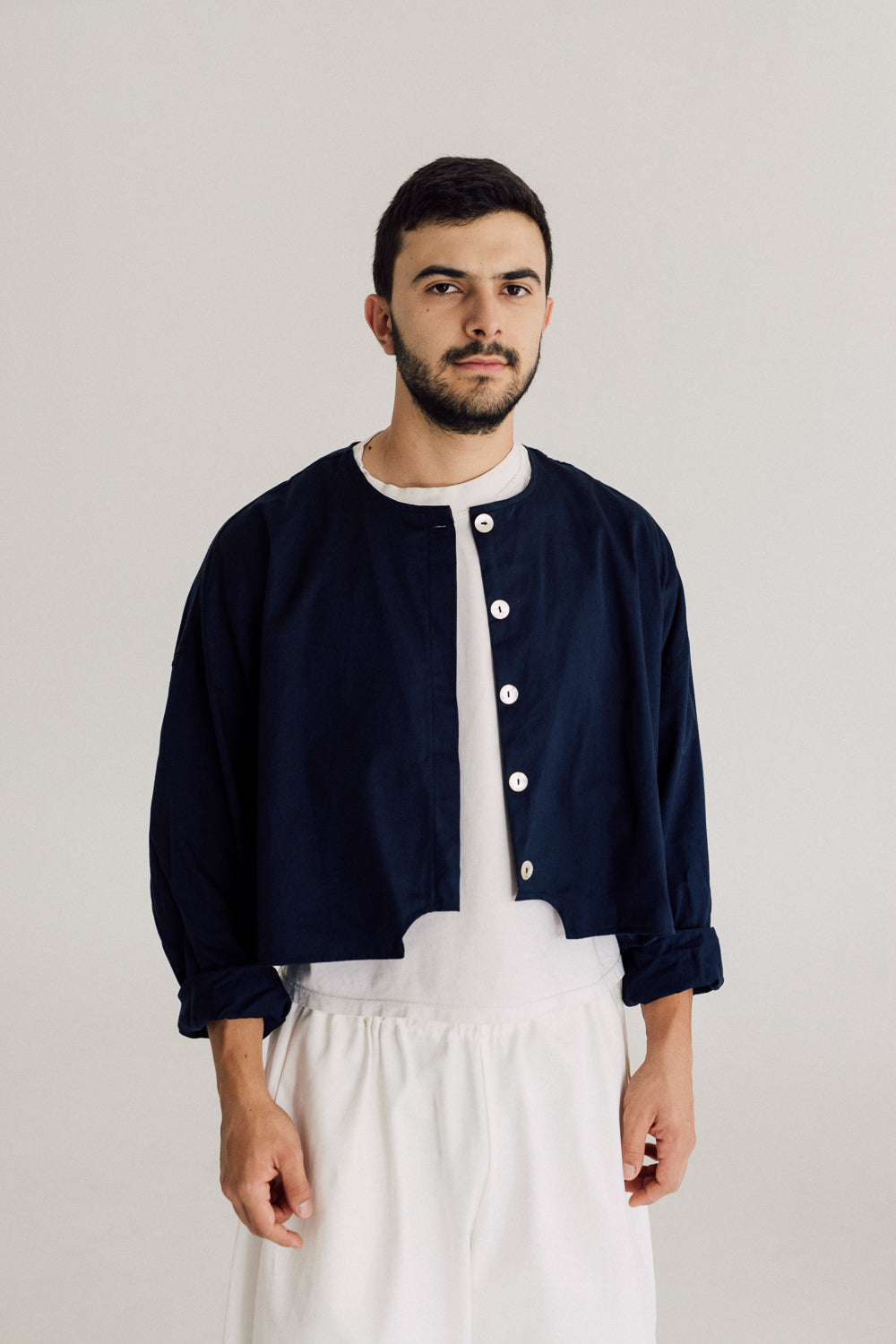 Esta chaqueta hecha en dril liviano 100% algodón incluye un detalle de moldería en el ruedo al centro que forma un medio circulo en negativo, con silueta corta de hombro rodado, cuello redondo y mangas largas que se reducen en el puño para ser remangada fácilmente y adaptarse al largo de brazo del usuario, los botones en concha nácar son el complemento perfecto para esta chaqueta dándole un toque de brillo natural y contraste.