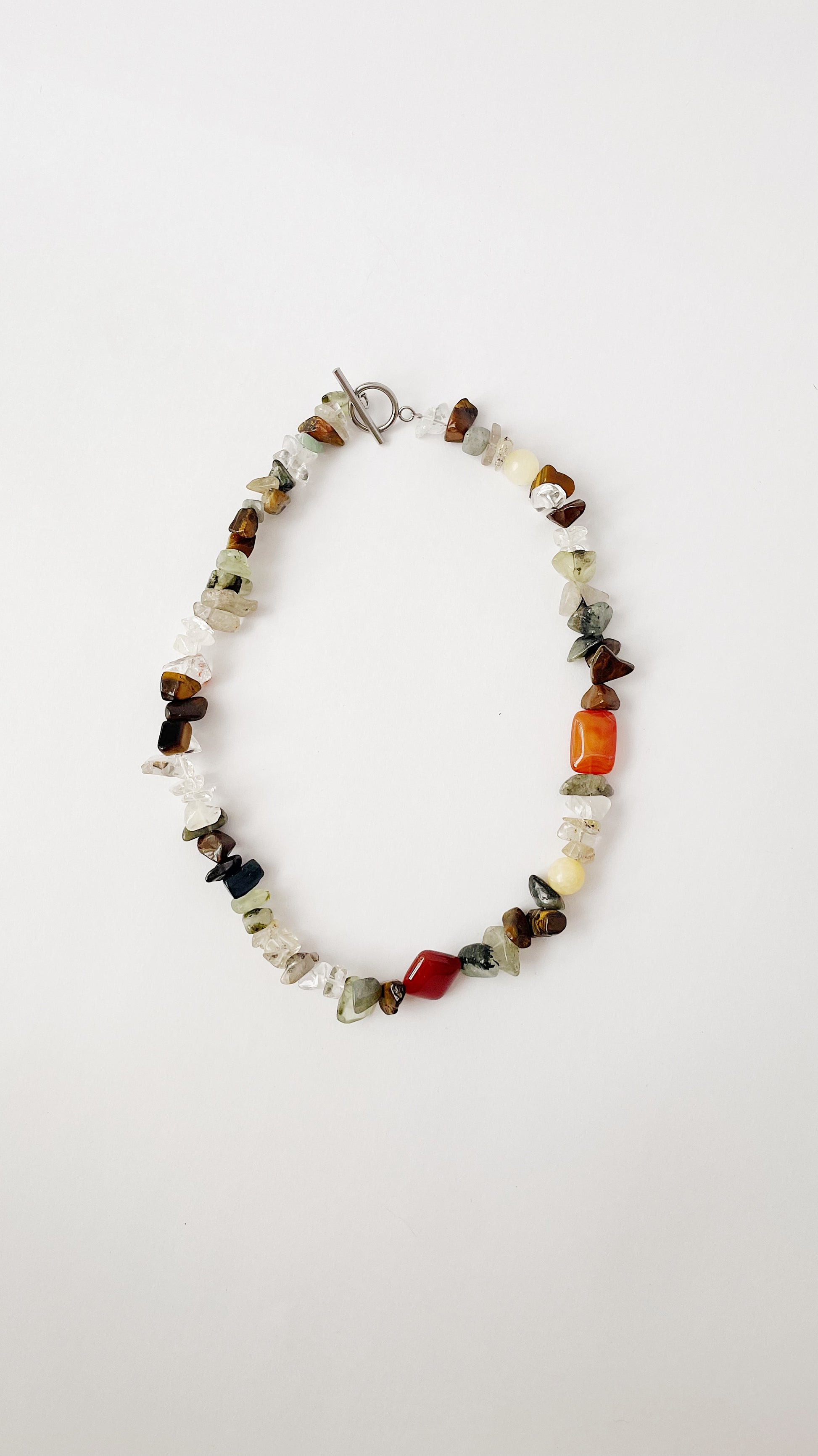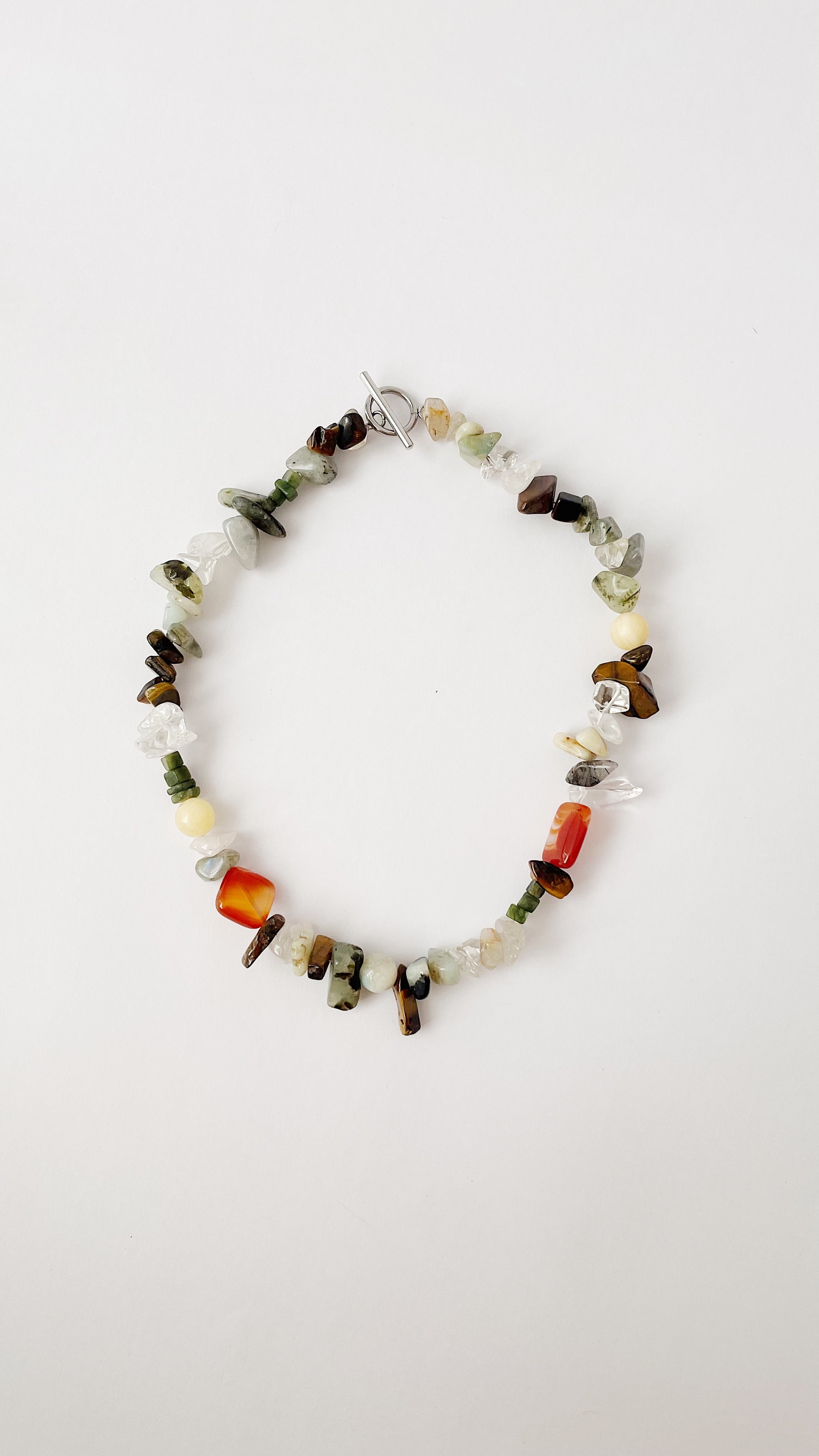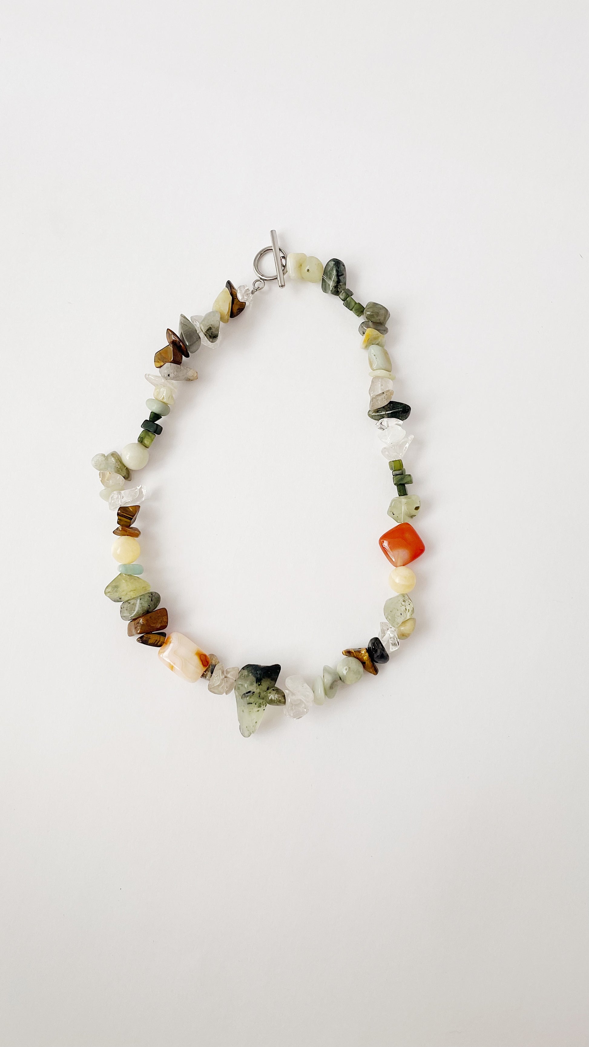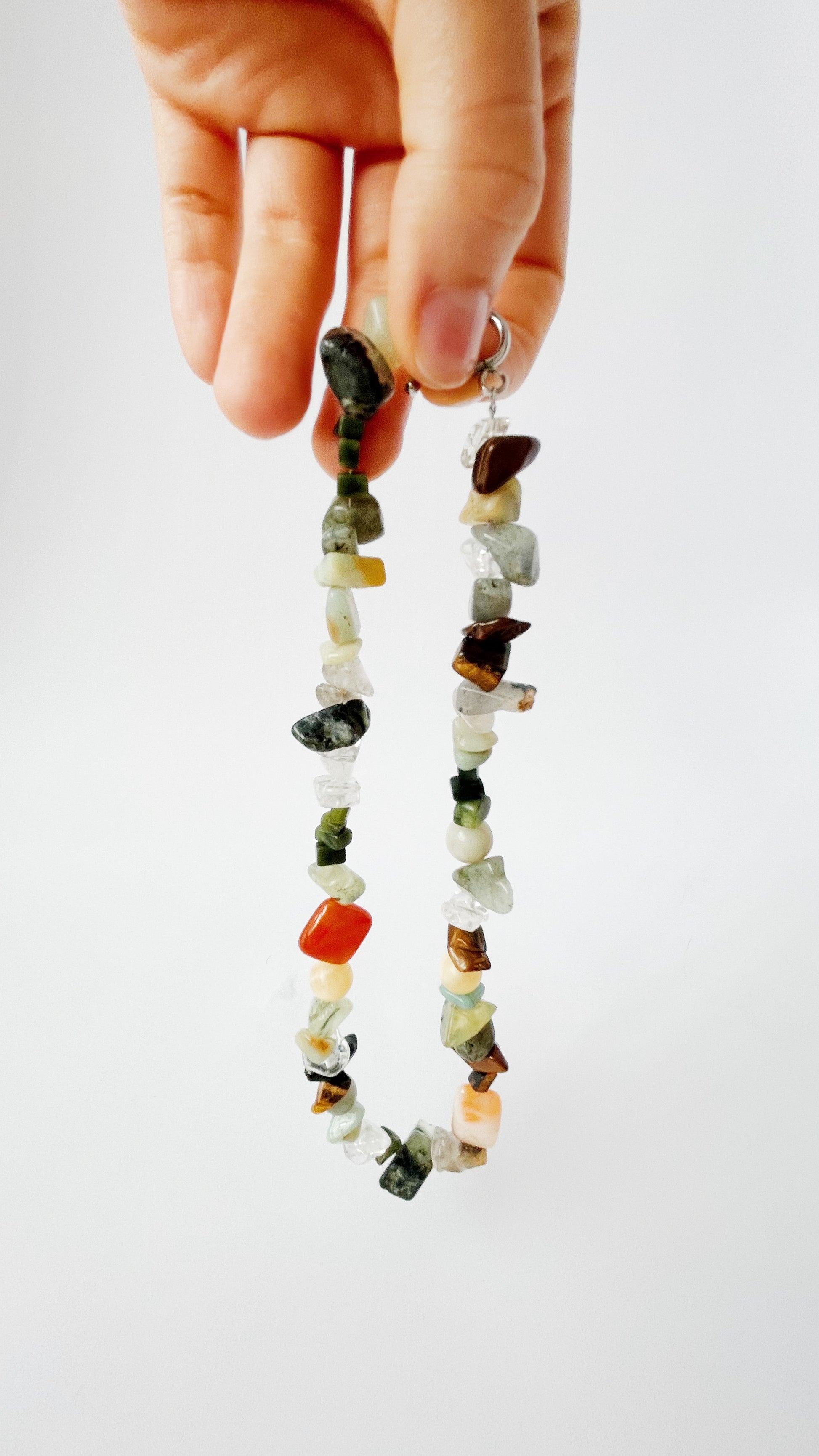 Cuarzo rutilado, ojo de tigre, jade amarillo, cornalina, prehnita, ágata musgosa, jade verde, amazonita, labradorita.