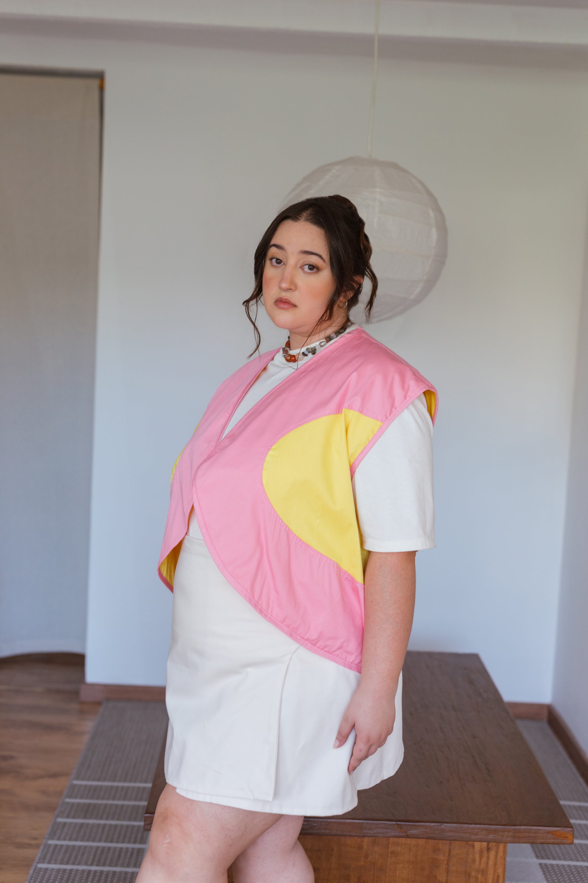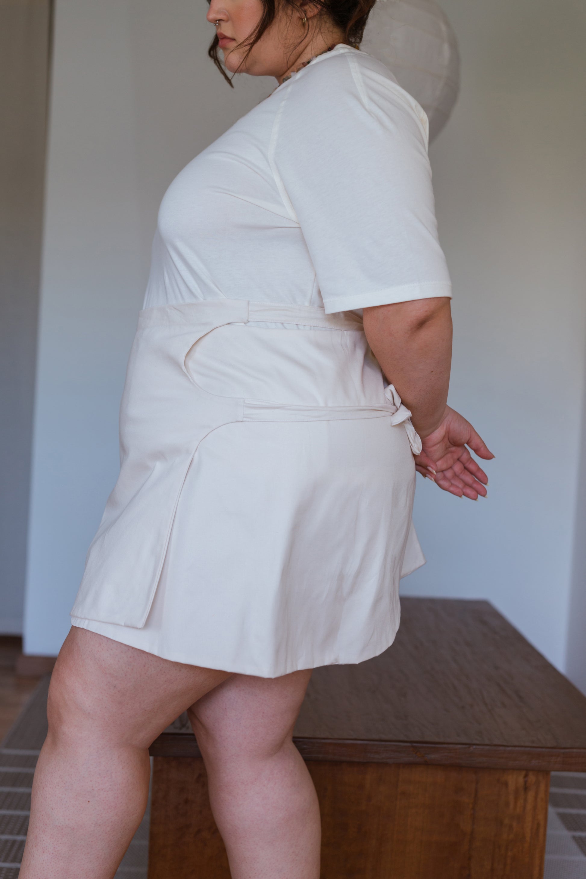 Ahora es una mini-falda tipo portafolio con dos juegos de amarres, uno interno para sujetar la prenda y otros exteriores como cierre final y amarres decorativos. El acabado en media-luna hace referencia a la inspiración de círculos de esta colección.