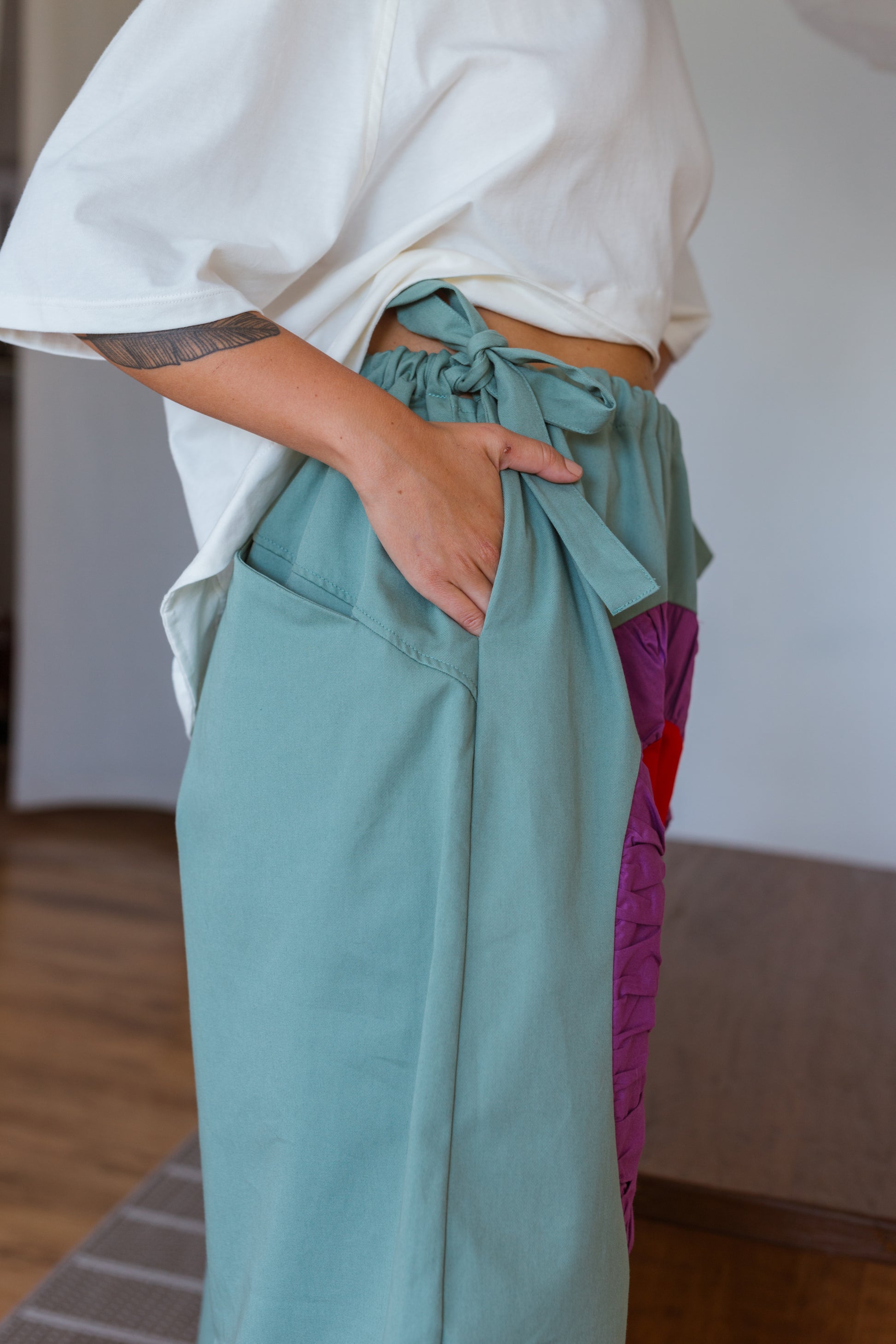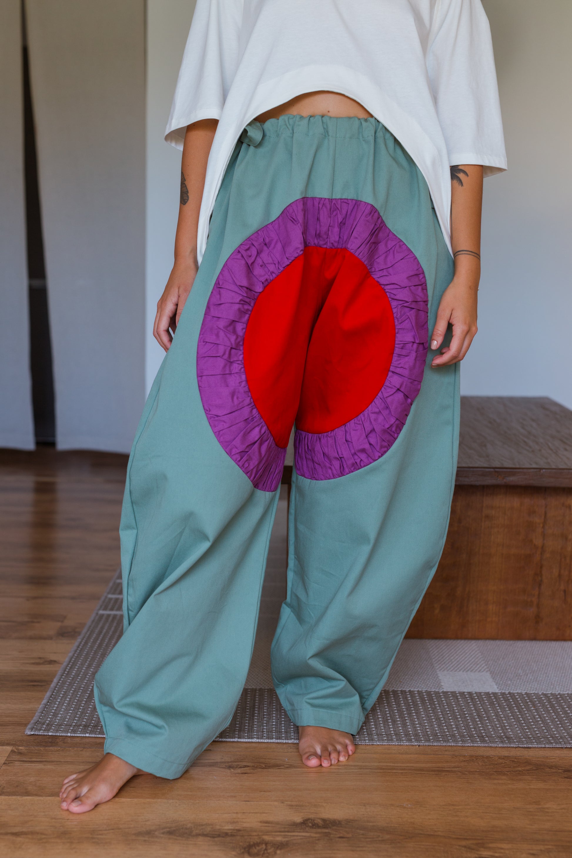 La característica principal del pantalón Irradia son sus cortes y recogidos en la zona de la entrepierna que crean la ilusión de rayos de luz y energía, haciendo referencia a la inspiración de esta colección, los chakras. Con su silueta tipo globo, es decir más ancho en la rodilla que en la bota y con un sistema de pretina único, esta prenda se convierte en un manifiesto de RIDDANCE y de esta colección.